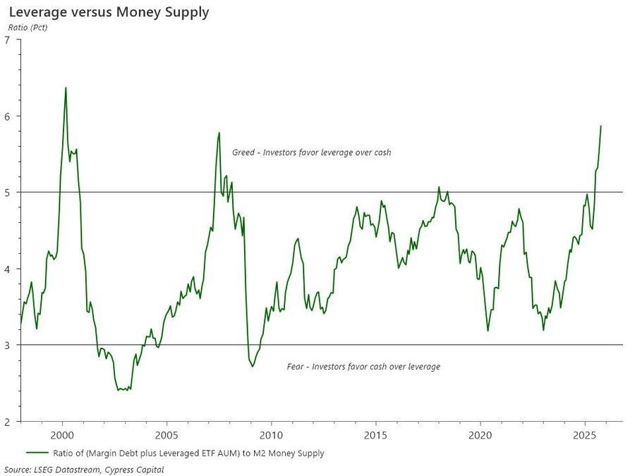 …and financial leverage that’s growing much faster than the money supply — which coincided with the previous two stock market crashes: