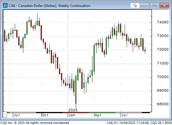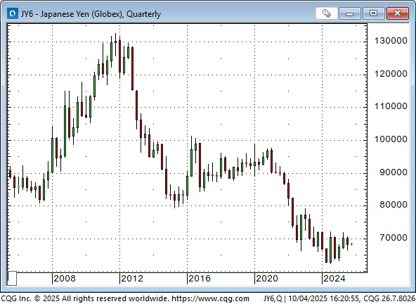 The CAD fell to a 22-year low of ~68 cents in February when Trump was threatening massive tariffs on Canada. It rallied back to ~74 cents at the end of June (when the USD bottomed out against most of the actively traded currencies). It is now below 72 cents, with signs that the Canadian economy is weakening (unemployment is above 7%). I expect further pressure on the CAD as the BoC continues to lower interest rates, the Prime Minister discusses shifting our trading focus towards Europe, and as the market realizes that Canada is vulnerable to additional tariffs from Trump.