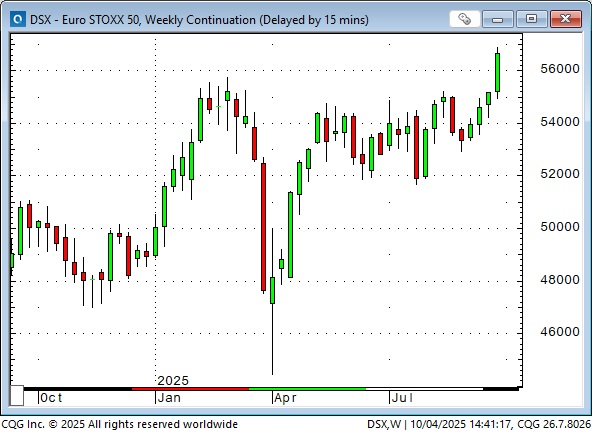 The Euro STOXX 50 index rallied to a new all-time high this week, up ~28% from its April lows.