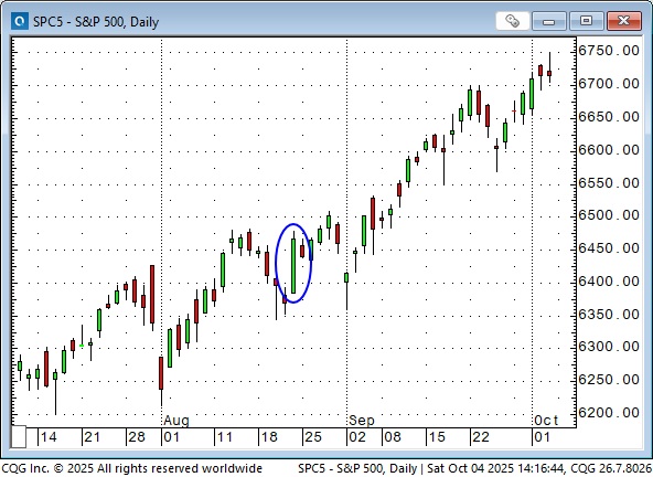 The S&P is up ~5.5% since the FOMC cut rates on August 22 (blue ellipse), and signalled more cuts to come over the next few months.