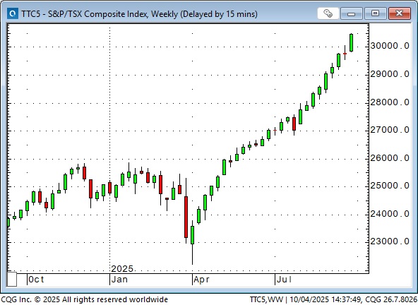 The “most impressive global stock index” award goes to the Toronto Composite, which has traded higher for 26 consecutive weeks since the April lows, rising ~36%.