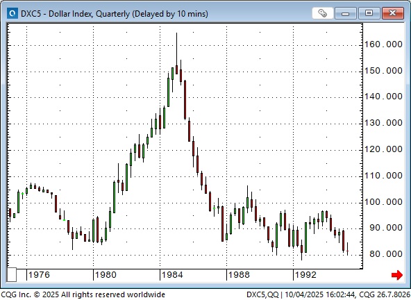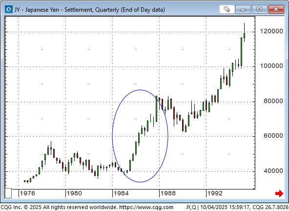 However, the Yen was not the only currency rising against the USD in 1985 to 1987 – all currencies were rising against the USD after it had soared from 1980 to 1985.
