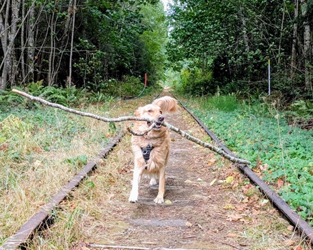 Barney has got to be one of the happiest dogs in the world, and nothing makes him happier than running with a good stick – the bigger the better! Here he is galloping along the old railroad tracks in the forest near our house.