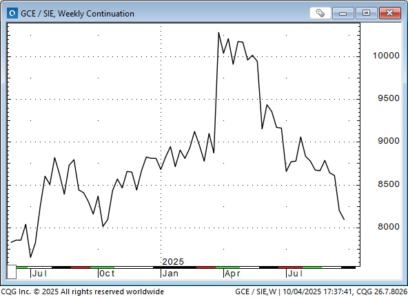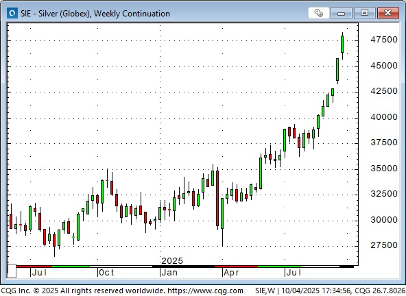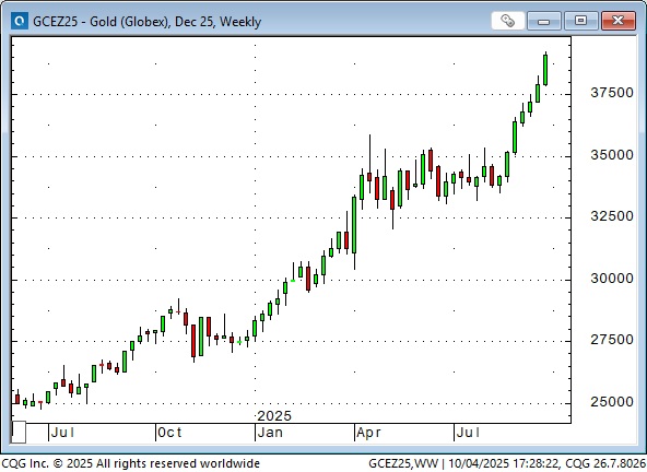 December Comex gold has closed higher for seven consecutive weeks, rising ~$575 (~17%). It appears to me that FOMO buying is making gold more of a “risk asset” than a “hedge.”
