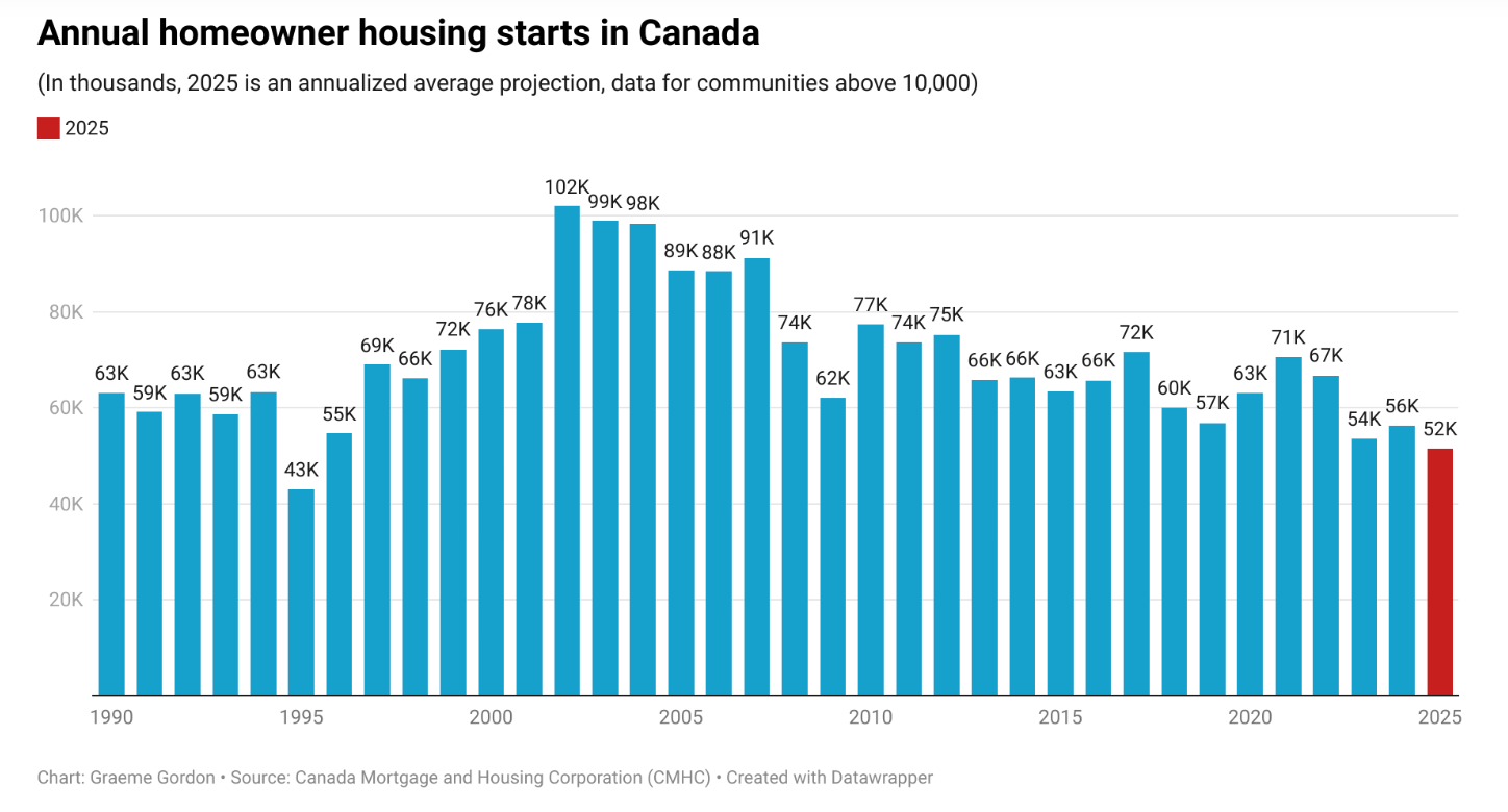 In fact, when you parse through the data it’s already concerning. Homeowner housing starts in 2025 show an average annualized rate of new builds tracking a 30 year low with only 41,384 homeowner housing starts recorded from January through October for cities or towns of over 10,000 people. We are on pace for just 51,545 new homeowner units started in 2025 per the Hub.