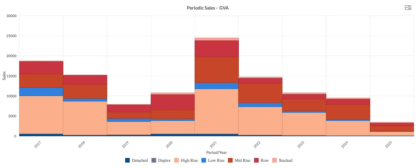 New home sales in Greater Vancouver are sitting at 3400 year to date, and should finish the year down about 60% from 2024, and nearly 85% below levels seen at the height of the bull market.