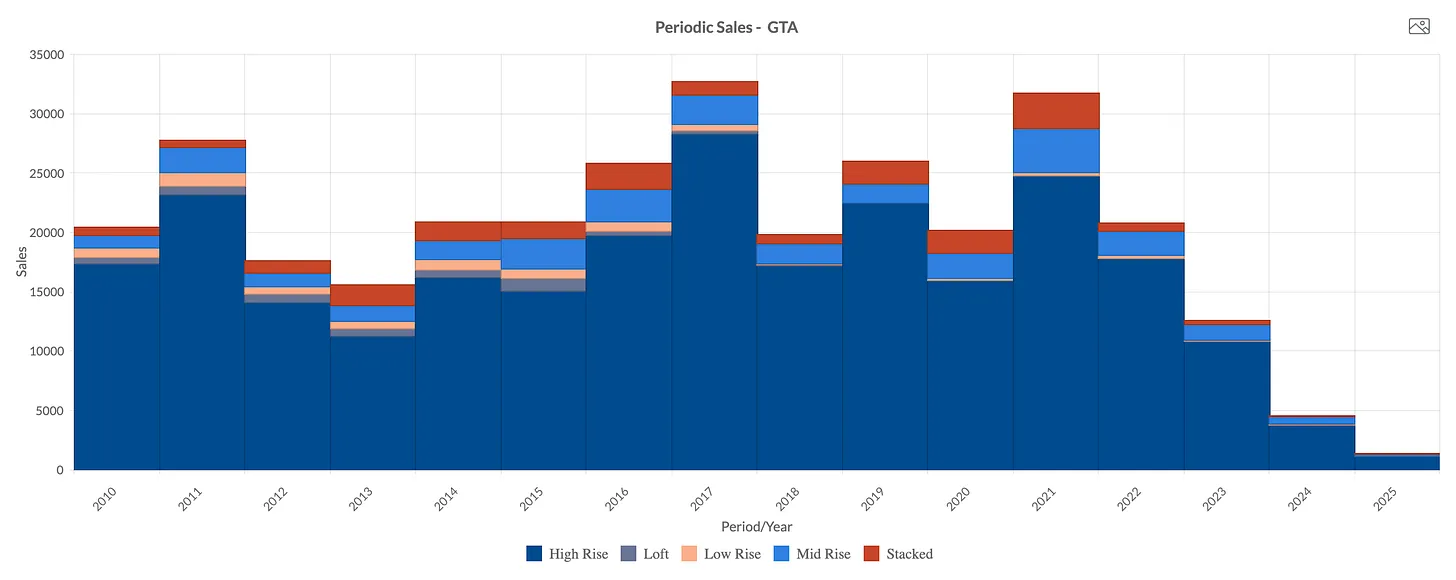 Things are even worse in the GTA where there’s been less than 1200 new home sales for the entire region. The average over the past decade is around 20,000 new home sales for the year. In other words, new home sales are effectively non existent in the GTA.