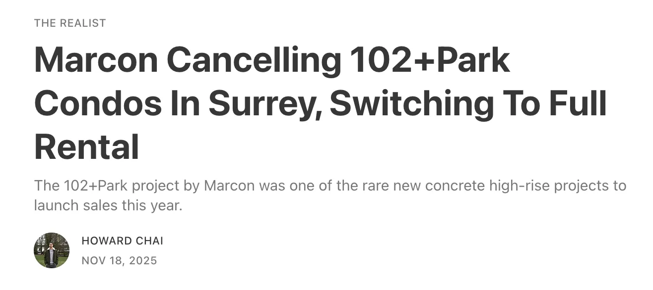 With condo pre-sales at a standstill more and more developers have been pivoting projects to rental, simply to keep employees on payroll and investors happy. We couldn’t help but notice the announcement from Marcon this month. Marcon launched presales in Spring 2025 and 102+Park was the only new concrete high-rise project to launch presales in Metro Vancouver in the first half of this year. It’s now pivoting.