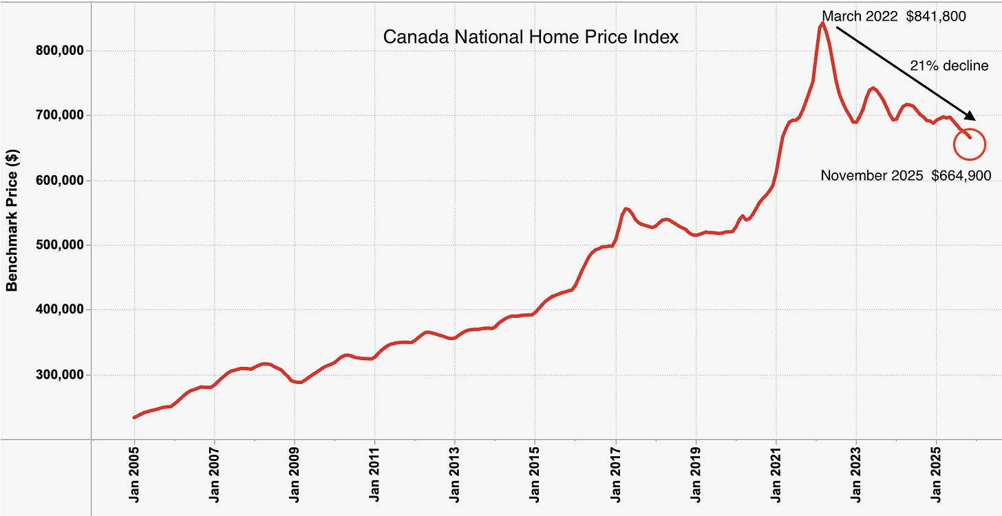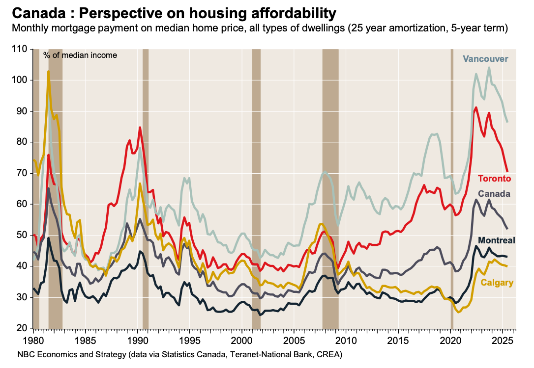 On a more positive note, falling home prices means affordability is coming back down to earth. According to National Bank, Canadian housing affordability posted a seventh consecutive improvement in Q3 2025. The mortgage payment on a representative home as a percentage of income fell 1.5 percentage points.