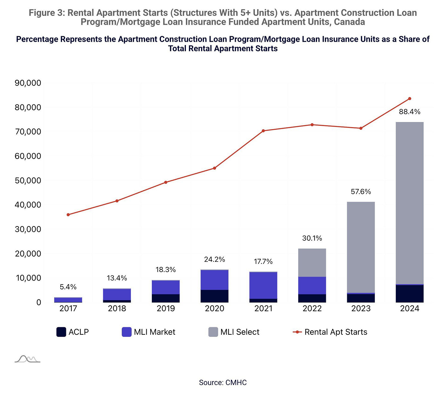 And so we have a situation today where vacancies are surging, and rents are plummeting. This is great for affordability, but problematic for balance sheets that were underwritten when immigration was booming. Remember, it’s not just developers and landlords bracing for impact, but the tax payer funded CMHC as well. They have pushed their exposure in the rental construction business from 5% in 2017 to nearly 90% today!