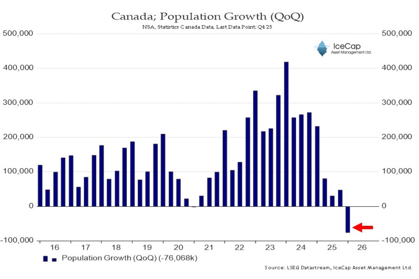 Human QE is over. Canada’s population outright contracted in Q3, shrinking by 76,000 people. This was the only quarterly decline on record outside the pandemic.