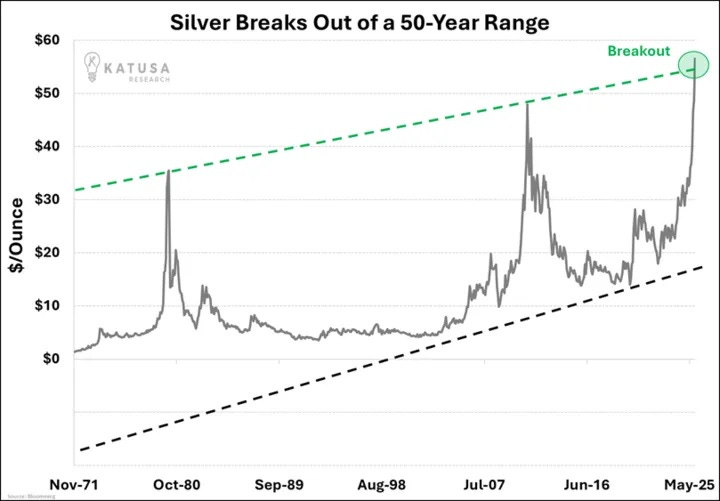 Because the moment the screens flickered back on Friday morning… Silver violently repriced to a new all-time high above $55.
