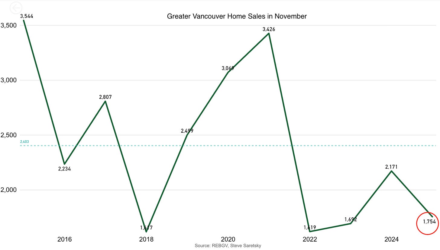 Here in Vancouver, we have home sales tracking around 1800 for the month of November. We should finish the month with home sales about 25% lower than their 10 year average. Not great.