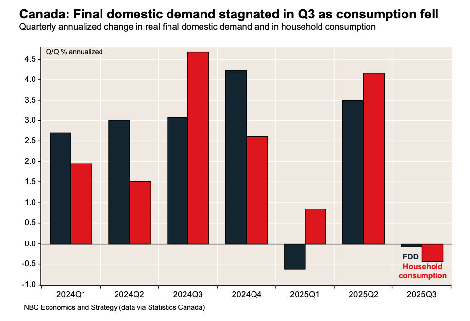 “The sharp drop in imports alone accounts for all of the growth in the quarter, while exports essentially stagnated after last quarter’s strong decline. We note that Statistics Canada pointed out that, given the U.S. government shutdown that took place in October, it did not receive data on Canadian exports to the U.S. for the final month of the quarter and thus resorted to special estimates.”