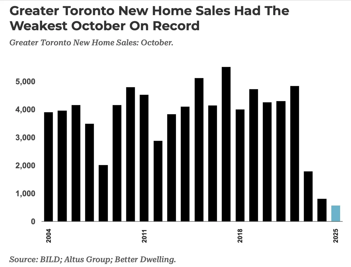 There were 570 new home sales in the Greater Toronto area in October, which was down 29% from October 2024 and 81% below the 10-year average. Ouch.