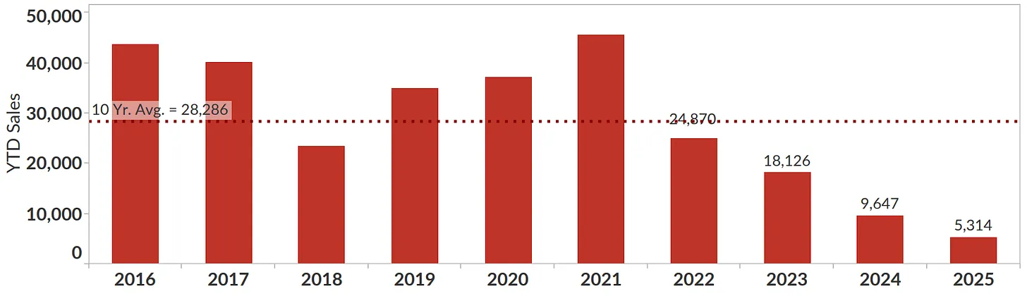 There were just 5314 new units sold in 2025. The lowest levels on record since they started collecting data, and 81% below the ten year average. Just for context, the population of the GTA has grown by more than 3 million people during that time, so the numbers are even more alarming when adjusting on a per capita basis.