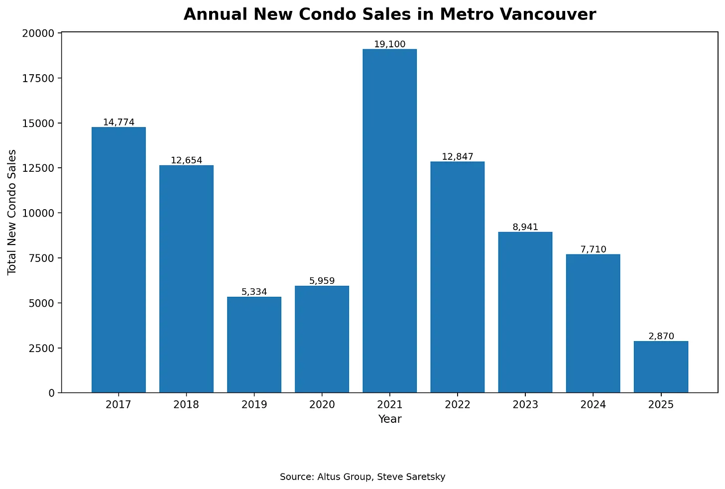 New condo sales in Metro Vancouver just had their worst year in a long time. Sales plunged 62% from last year and are down a whopping 85% from peak levels in 2021.