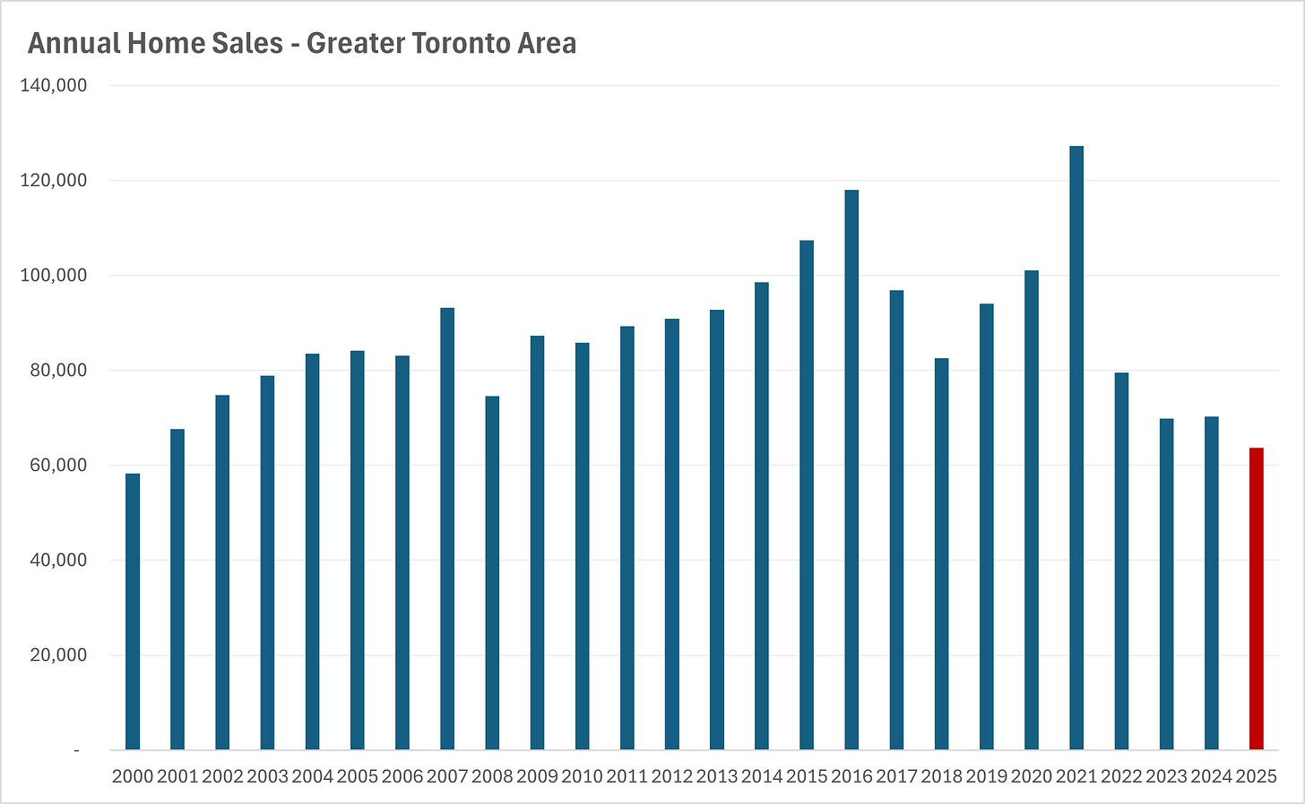 Toronto home sales fell to their lowest levels since the year 2000, despite adding over two million people to the region since then.