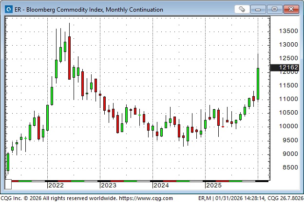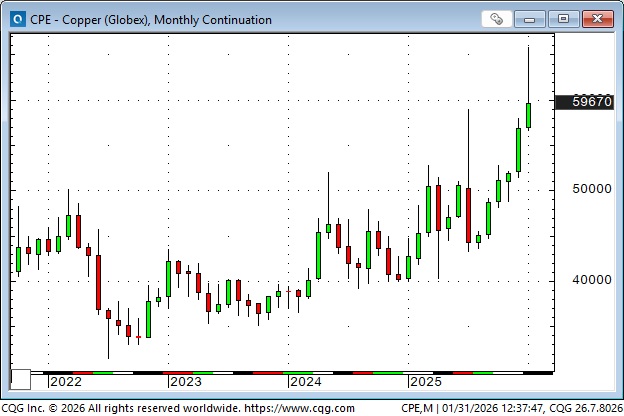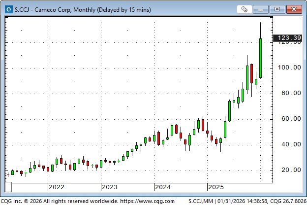 Uranium is not a “precious metal” (maybe it should be), but my barometer for the uranium market is the Cameco share price, which has risen nearly 4X from the April 2025 lows. It dropped ~10% from Thursday’s record highs to Friday’s lows, but still posted a record monthly high, up ~35% from December’s close.