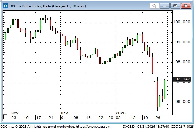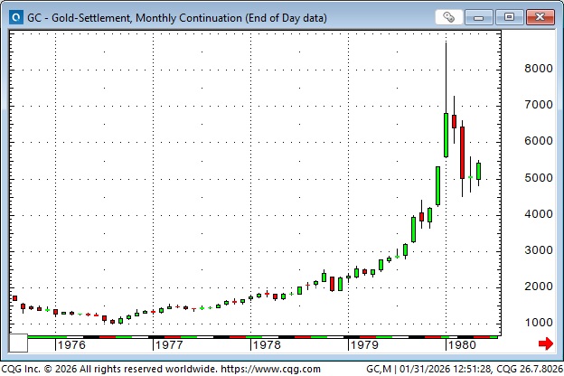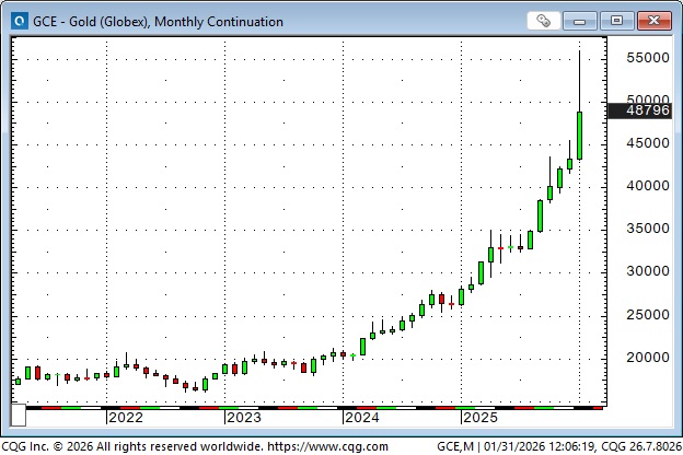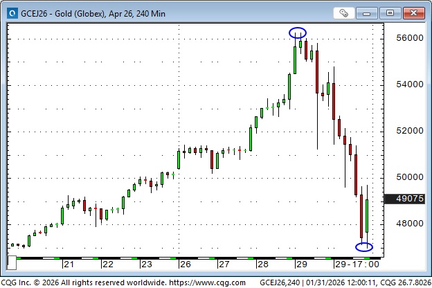 Comex April gold futures reached a record high of ~$5,627 during the overnight session on Wednesday (January 28). Then they began a dramatic 40-hour sell-off that reached a low of ~$4,700 during the Friday day session. Top to bottom, the sell-off was ~$927, or ~16.5%.