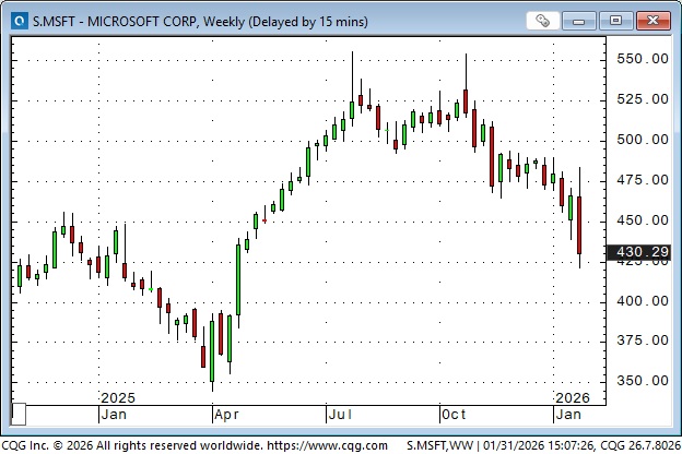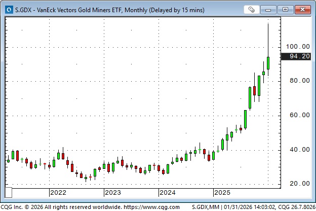 The gold miners ETF more than tripled from January 2025 to this week’s record highs. The sharp sell-off from Thursday’s highs to Friday’s lows saw the market drop ~18%. Like the metals, GDX also registered a record-high monthly close despite the sharp sell-off, closing January ~9.5% above December’s close.