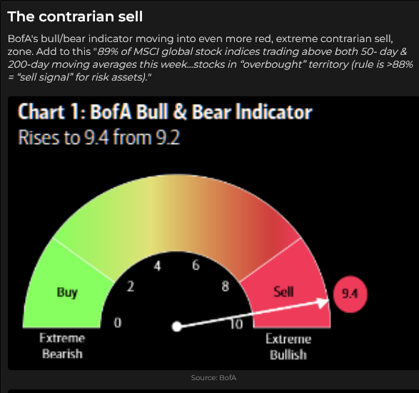 S&P futures hit a record high at 7,043 on Wednesday, but dropped ~140 points to Thursday’s low as cross-asset investor sentiment was becoming a little sketchy. Quarterly corporate reports were not driving the market to new highs. (In last week’s Notes, I suggested that if the broad market did not rally on strong corporate reports, that could be viewed as a “news failure,” and might lead to a sell-off, given very bullish investor positioning).