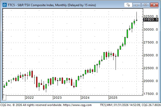 The TSX Composite Index has also been buoyed by rising metal prices, reaching an all-time high on Thursday, up ~50% from the April 2025 lows. The Index dropped ~5% from Thursday’s highs to Friday’s lows, but, like the metals, it managed to record a new monthly high, albeit by only a whisker.