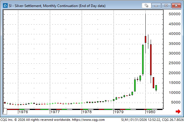 Comex March silver futures reached a record high of ~$122 on the opening of the Thursday (January 29) day session, and then began a dramatic 34-hour sell-off that reached a low of ~$74 during the Friday day session. Top to bottom, the sell-off was nearly $48, or ~39%.