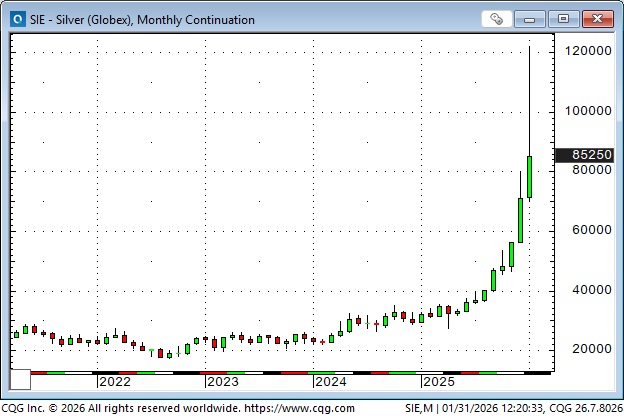 Despite the swift decline, Comex silver posted a record-high monthly close in January, ~$14 above December’s close.