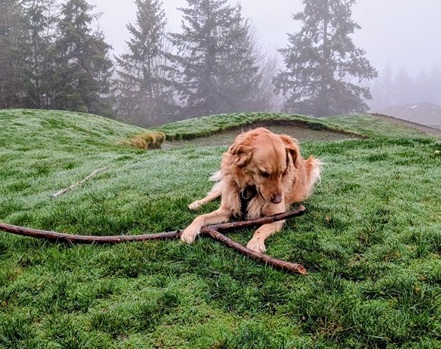 I try to let Barney go off-leash as much as possible when we’re out walking. He likes that, and I do too, because he’s happy and he’s not constantly tugging at his leash! He loves chewing on sticks! The only thing he likes more is proudly running with a stick – the bigger the better!