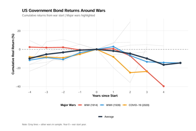 A February 2026 academic study examining 300 years of U.S. and U.K. data reaches a blunt conclusion: government bonds are not safe during a major war.