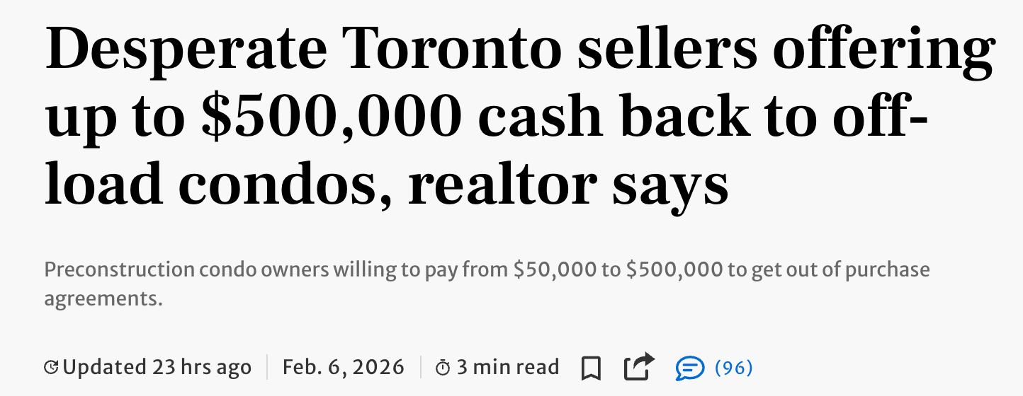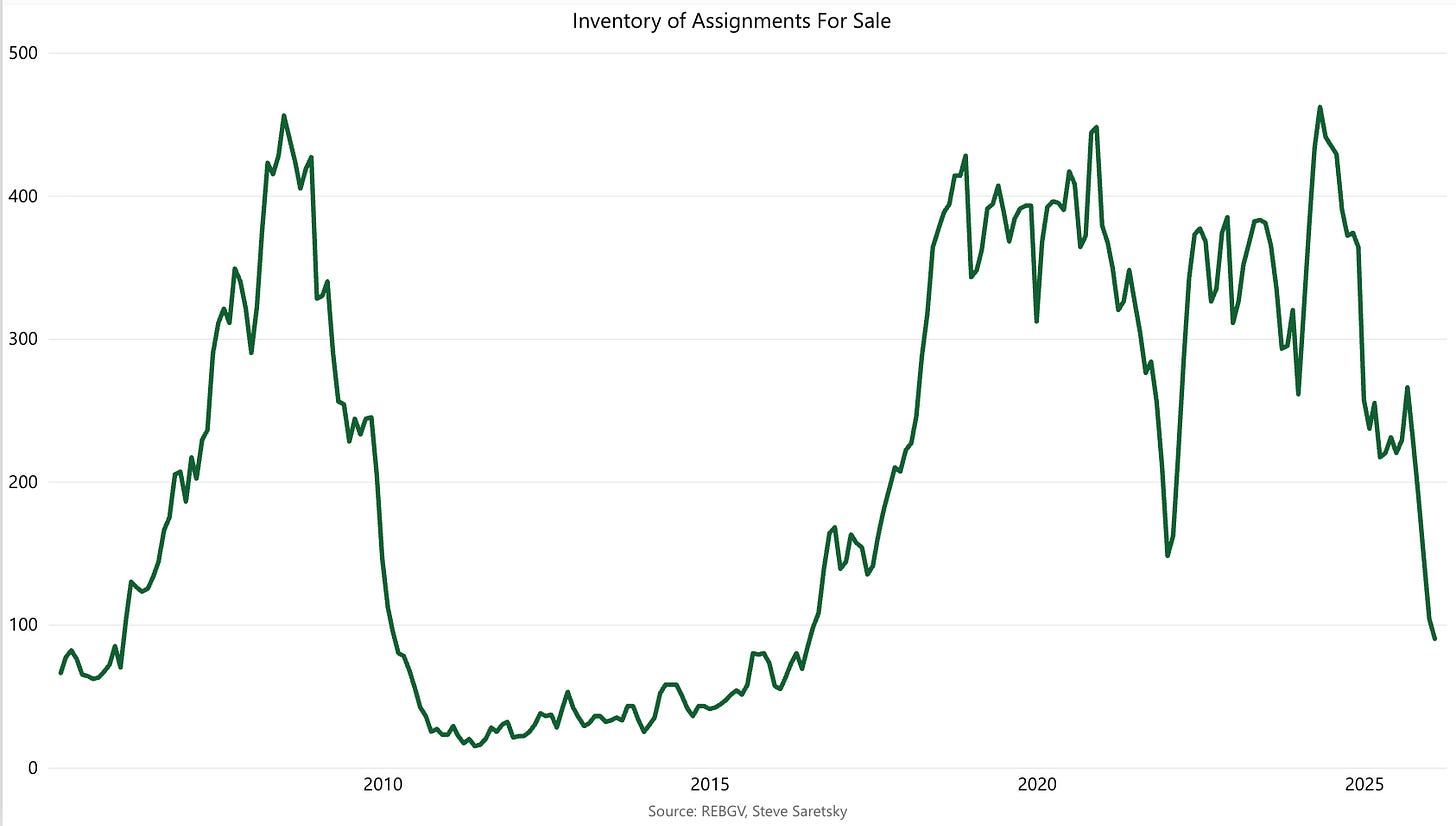 The number of assignments listed for sale (Greater Vancouver & Fraser Valley) have plunged from 462 listings on the MLS in April 2024 to just 90 by the end of January 2026.