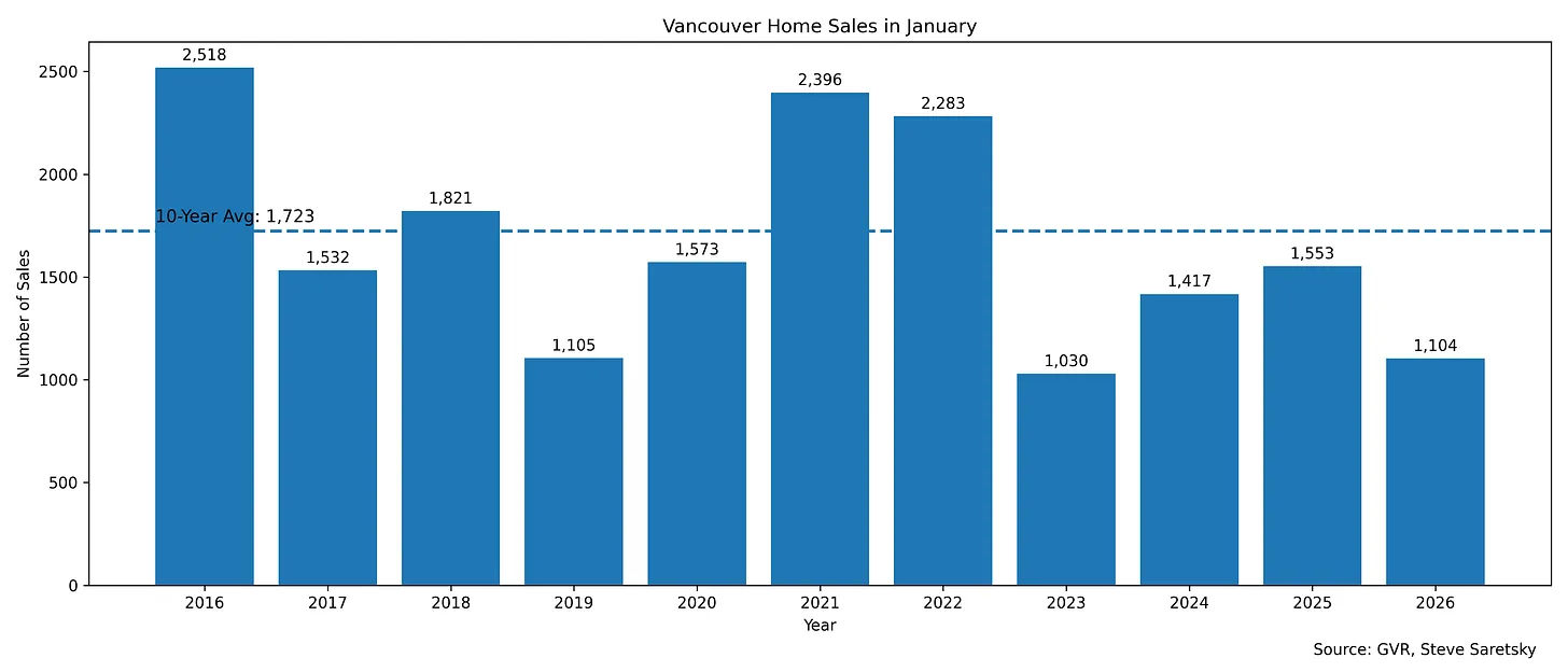 As we noted last week, Greater Vancouver home sales continued their slump into 2026. January home sales fell 29% year-over-year in January, and were a whopping 35% below the 10 year average.