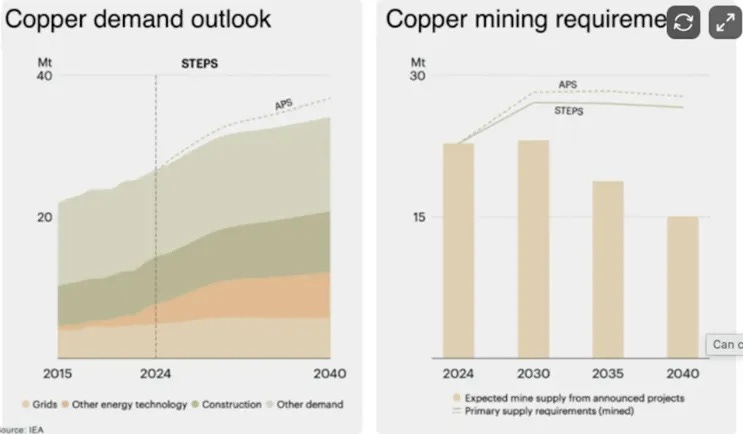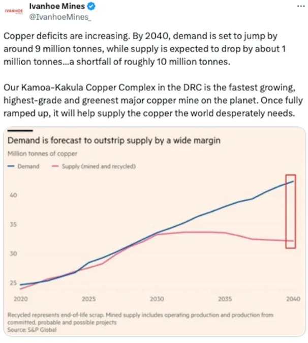 Ivanhoe Mines wrote that “Copper deficits are increasing. By 2040, demand is set to jump by around 9 million tonnes, while supply is expected to drop by about 1 million tonnes… a shortfall of roughly 10 million tonnes.”
