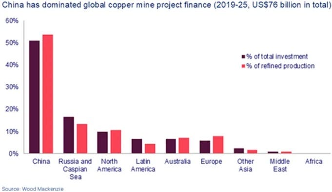 “Unlike their Western counterparts, Chinese miners have aggressively pursued opportunities in higher-risk jurisdictions. Of the US$76 billion invested globally in green and brownfield copper supply between 2019 and 2025, around 50% came from Chinese miners.”