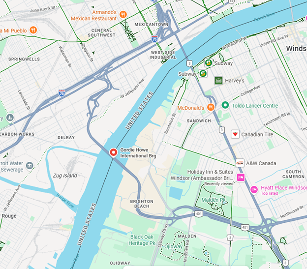 The new Gordie Howe crossing fixes that. It directly connects Highway 401 in Canada to Interstate 75 in the U.S., giving commercial traffic a smooth, uninterrupted route (see left centre). Up to 10,000 trucks a day are expected to shift to the new corridor, dramatically easing pressure on local streets. Note that in Windsor you must travel north to get to the U.S.!