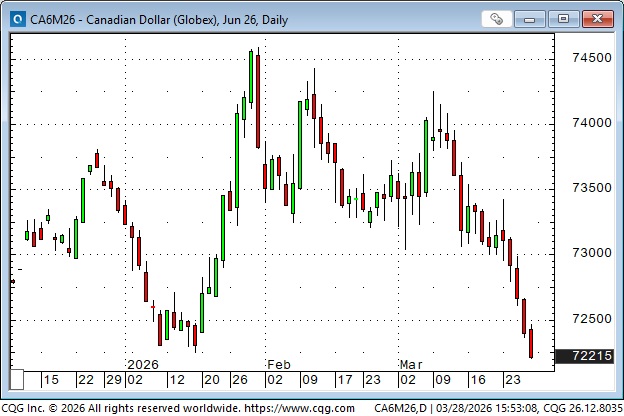 The Canadian Dollar rallied ~3.5% in 8 trading days in late January (as the USD was falling sharply against all currencies). It weakened in February, then initially rallied in early March when the Iran war began (I called it a petro-currency!), but since then, the CAD has just been one of many currencies that have tumbled against the USD as the Iran war continued.