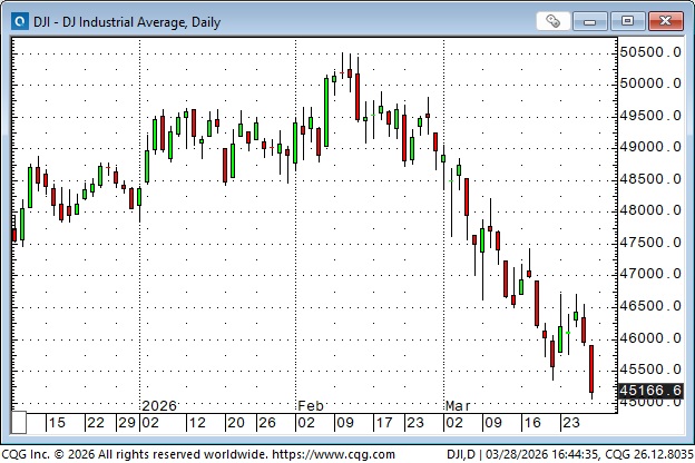 The DJIA is down more than 10% from its record highs in mid-February, with its lowest weekly close since August 2025.