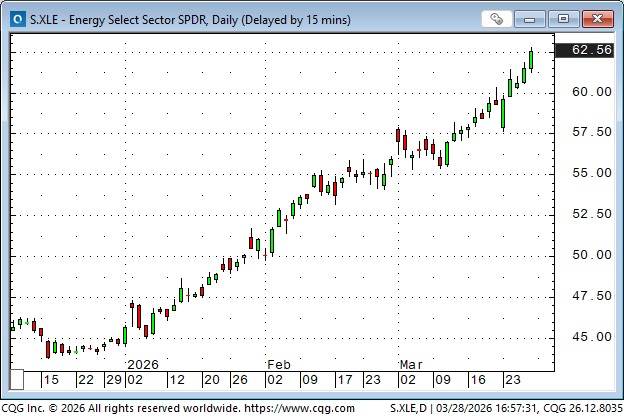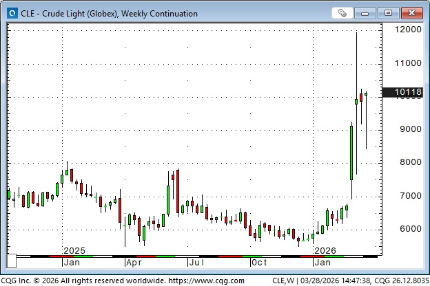 Nymex WTI front-month futures traded as low as $55 in December and January, closed at ~$67 on February 27 before the initial attacks on Iran, and closed this week at ~$101, which is the highest weekly close since July 2022. That’s an increase of ~51% since the war started.