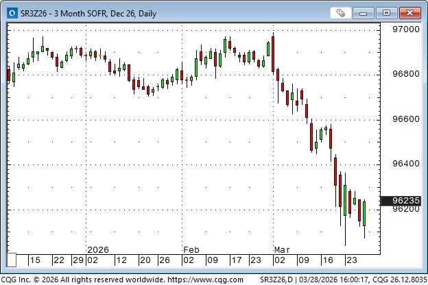 Before the Iran war started, December 2026 SOFR futures were pricing two 25 bps cuts from the Fed by December 2026. The forward markets are now pricing a possible increase in short rates before the end of the year, due to expectations that sharply higher energy prices may feed through to higher inflation.