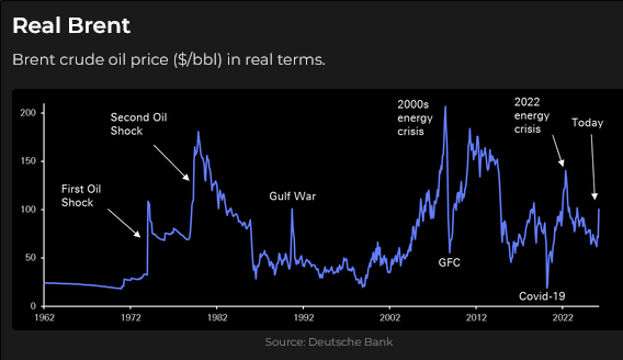 On an inflation-adjusted basis, the current Brent price spike is not unusual.