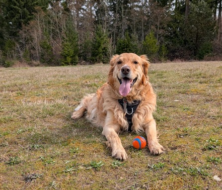 Barney loves to chase a ball, and he’s getting better at bringing it back to me after I throw it. Here he is, taking a rest after twenty minutes of ball chasing.