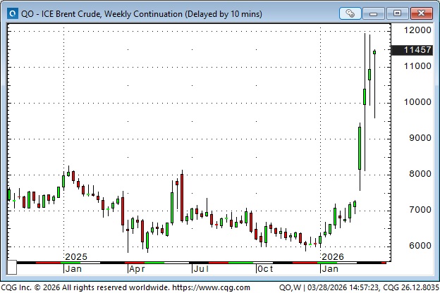 ICE Brent front-month futures traded as low as ~$60 in December and January, closed at ~$72.50 on February 27, and closed this week at ~$114.50, which is the highest weekly close since June 2022. That’s an increase of ~58% since the war started.