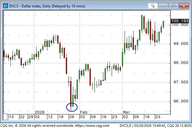 The DXY US Dollar Index hit a 4-year low near the end of January (blue ellipse) as precious metals and the S&P were making all-time highs. It rallied ~2% in February and another ~2% in March (safe-haven flows?).