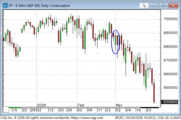 S&P futures reached a record high of ~7,000 in January and early February, and closed at ~6,900 on February 27. The market opened lower on March 2, but closed higher on the day (blue ellipse), perhaps thinking that the war would be over quickly. Friday’s close at ~6,400 is down ~8.5% from the January highs, and was the lowest weekly close since July 2025.