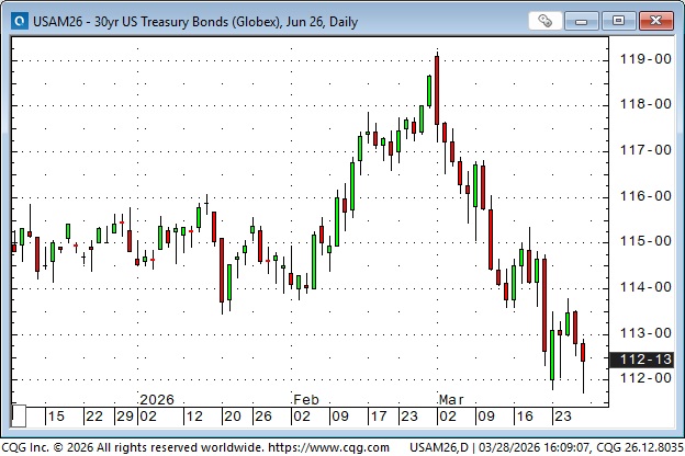 Treasury bond futures were near 12-month highs at the beginning of March, but tanked as energy prices soared. The 30-year yield touched an 8-month high of 5% on Friday.
