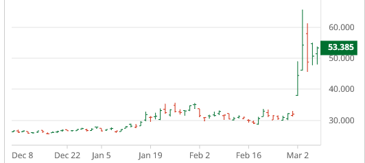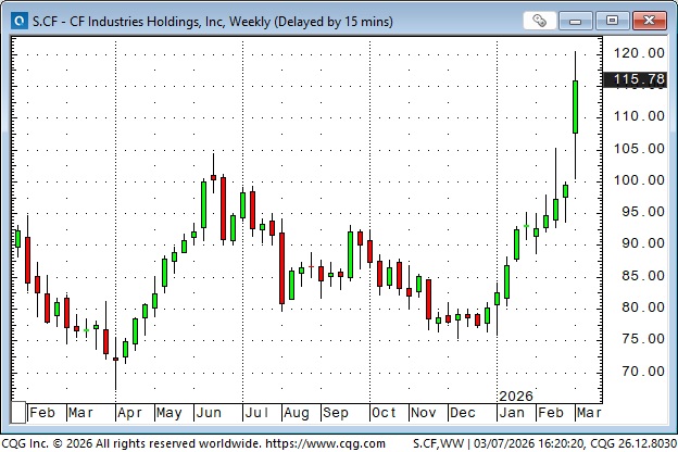 25 to 30% of global fertilizer raw materials pass through Hormuz. Share prices of fertilizer companies were sharply higher this week.
