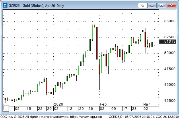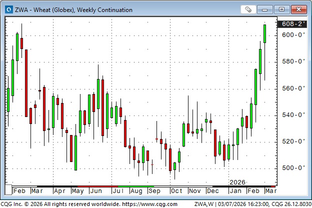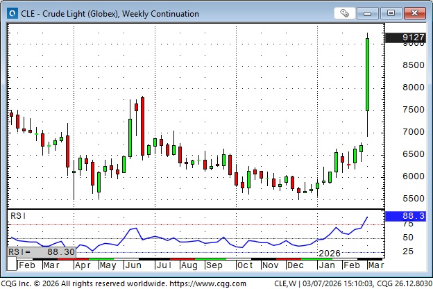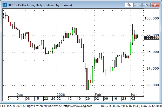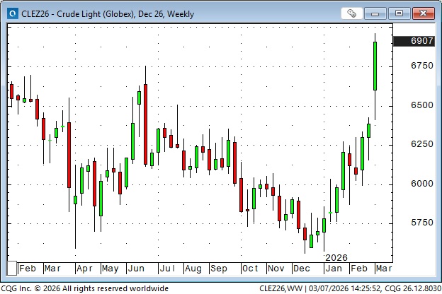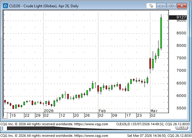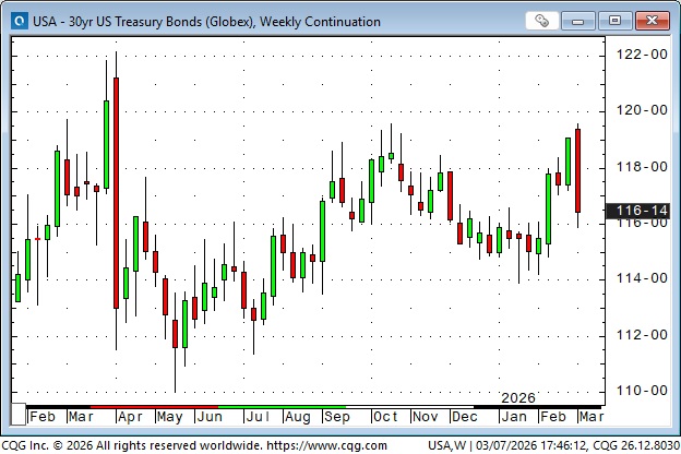 Bond prices gapped higher Sunday afternoon to 4-month highs, but reversed sharply and traded lower every day this week, posting the largest weekly decline since Liberation Day in April 2025. Surging energy prices are toxic for bond prices. War is inflationary. Friday’s NFP employment report was far worse than expected, and the bonds went bid for a few minutes, but it didn’t last, and prices made new lows for the week.