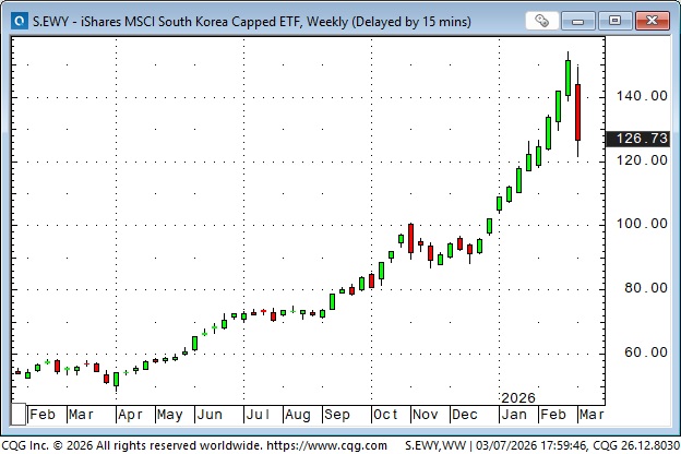 As reported here last week, the leading Korean ETF rallied nearly 200% from April 2025 lows to last week’s highs, but plunged ~22% to this week’s lows (on MASSIVE volume) as sharply rising crude oil prices hit high-flying risk assets. (Check Bob Farrell’s Rule #4: “Exponentially rising or falling markets usually go further than you think, but they do not correct by going sideways.”) Stock markets outside the USA were stronger than the S&P in January and February, but that ended on Monday, when “risk-on” shifted to “risk-off.”