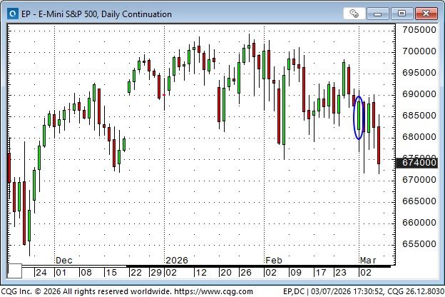 The S&P opened lower on Monday in response to the weekend attack on Iran, but then rallied to close above Friday’s close (blue ellipse) as WTI gapped nearly $10 higher on Monday but then fell back ~$5.